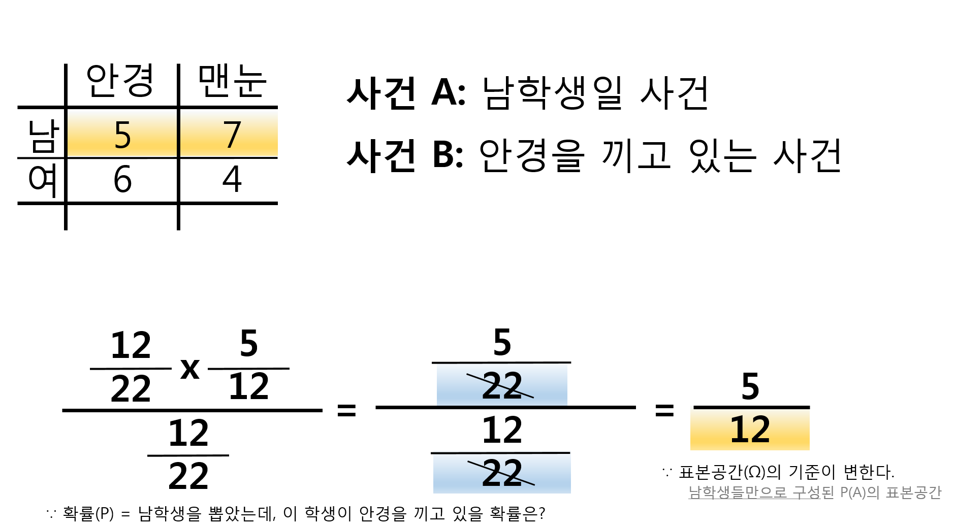이미 주어진 사건 A(given A)의 표본공간(Ω)으로 기준이 변경된다.