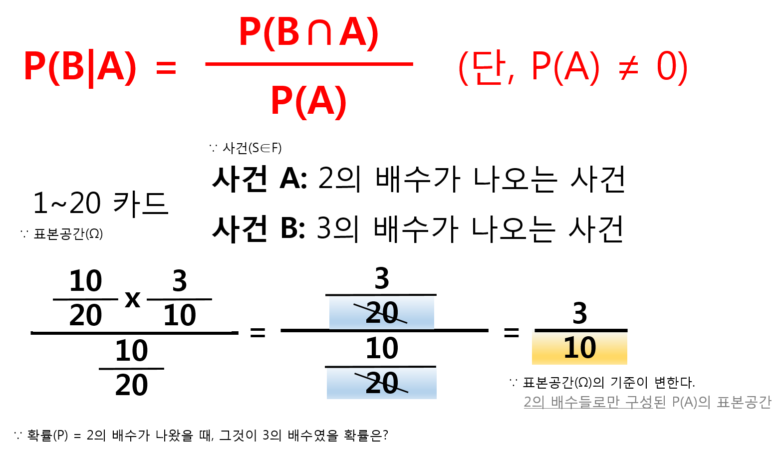 조건부 확률의 경우에도 이미 주어진 사건 A(given A) 확률에서 사건 B가 일어날 확률을 구하는 것이기 때문에,