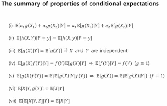 - \(E[g(x)|Y=y]\) = \(\int_x g(x)\, dF_{X|Y}(x|y)\)